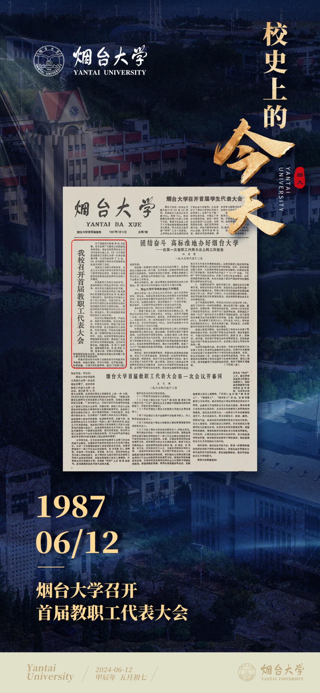 【編者按】2024年是新中國成立75周年,也是煙臺大學建校40周年。40年來,誕生于改革開放時代大潮中的煙臺大學,植根齊魯文化沃土,傳承北大清華基因,弘揚改革開放精神,勇擔教育強國使命,書寫了一段段滋蘭樹蕙的育人故事,譜寫了一曲曲乘風破浪的奮進贊歌。為慶祝煙臺大學建校四十周年,新聞中心(融媒體中心)推出“校史上的今天”欄目,以時間為線索,擷取煙大建校發展史上具有代表意義的重大事件,重溫閃耀在歷史長河中的昔年今朝,追憶在鹽堿灘上白手起家、艱苦創業的崢嶸歲月,展現辦學歷程中取得的新發展成就,啟迪新時代煙大人在新征程中再創新輝煌。