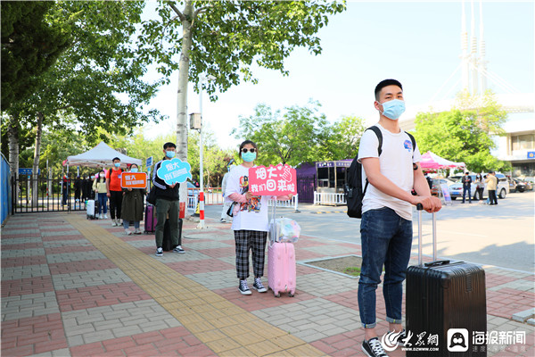 學生在到達各接站點后,會進行體溫檢測、行李消殺,并在輔導員老師的全程陪同下到達煙臺大學東門,此過程為“閉環式”接站,旨在最大程度上保障學生安全。更溫馨的是,每一名返校復學的同學都會獲得一枚印有“面朝大海,迎你歸來”字樣的袖標,這是煙臺大學給予學子的一枚暖心“印記”。