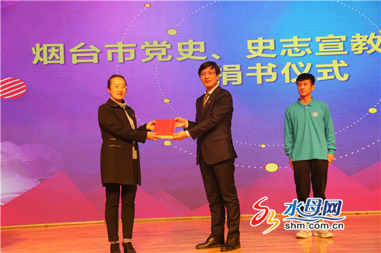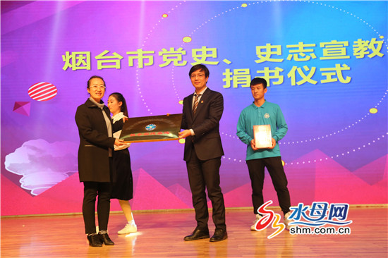 晚會上,煙臺市委黨史研究院副院長李迎春與煙大核學院教工黨支部書記、核裝備系主任趙相金共同為煙臺市黨史史志宣教基地揭牌,并向煙臺核學院贈送了《煙臺改革開放實錄》、《煙臺市志(1978—2002)》以及紅色系列叢書等共計200余冊。
