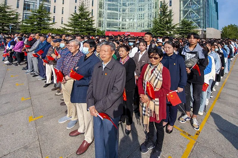 10月1日上午9時,鏗鏘有力的腳步聲在廣場上響起,在場師生屏氣凝神把目光投向國旗護衛隊走來的方向。由30名在校生組成的國旗護衛隊挺拔威武,邁著整齊的步伐,護衛國旗走向升旗臺。伴隨著威武雄壯的《義勇軍進行曲》,鮮紅的五星紅旗冉冉升起,在場師生齊唱國歌,肅立行注目禮,共同感受這一莊重而自豪的時刻。