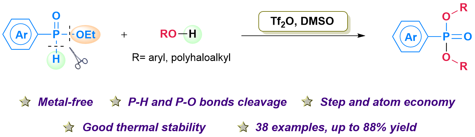 我校楊斌副教授課題組一直專注于有機(jī)磷化學(xué)領(lǐng)域的研究,近年來,他們開發(fā)了Tf2O/DMSO的反應(yīng)體系,利用極性翻轉(zhuǎn)的策略將親核性的磷原位轉(zhuǎn)化為親電性的磷,并分別實現(xiàn)了多種P-X(X= O, S, F, N)化學(xué)鍵的高效構(gòu)筑。最近,他們又利用該體系實現(xiàn)了對芳基次膦酸酯的P-H鍵和P-O鍵的雙活化反應(yīng),高效制備了一系列芳基磷酸酯類化合物(圖1)。該研究成果以“Tf2O/DMSO-mediated dual activation of aryl phosphinate to access various aryl phosphonates”為題發(fā)表在《Chemical Communications》。該論文第一作者為我院2021級碩士研究生岳慧琪,通訊作者為楊斌副教授。