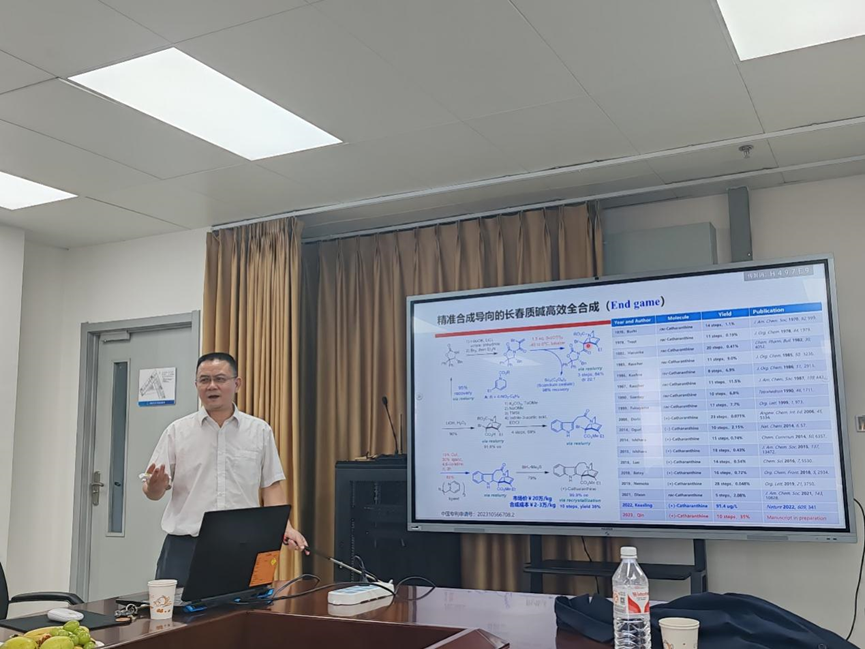 秦勇教授作了題為“精準合成化學導向的天然產物全合成-從基礎研究到產業應用”的學術報告。報告會主要從基礎研究和產業應用兩個方面進行分享,秦勇教授以顛覆性的精準仿生合成技術改變嗎啡類藥物的產業模式為例,詳細介紹了其團隊從基礎研究到產業應用的研究過程。同時,秦勇教授還以基礎與應用并行的天然產物全合成為例,介紹其團隊在減重藥奧利司他、抗凝血藥磺達肝奎鈉等復雜結構的天然藥物產業化方面的進展。報告結束后,秦教授與在場師生展開探討交流,現場氛圍熱烈活躍。
