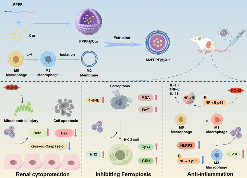 Ferrostatin-1(Fer-1)通過4-羧基苯硼酸(4-PBA)和巖藻多糖(Fuc)與姜黃素(Cur)組裝,構建ROS響應納米遞送系統(FPPF@Cur),進一步涂覆M2巨噬細胞膜(M2M)形成多功能仿生納米RONS清除劑(M2FPPF@Cur),設計用于將Cur靶向遞送到受傷的腎臟。相關成果以“Biomimetic Reactive Oxygen/ Nitrogen nanoscavengers inhibit “ferroptosis storm” and modulate immune targeting for acute kidney injury”為題發表在藥劑學著名期刊《Journal of Controlled Release》(1區TOP期刊,IF=10.5)上,碩士研究生曹玉昕、劉曉偉為論文的共同第一作者,陳大全教授為論文的通訊作者。相關工作得到了山東省泰山學者計劃、山東省自然科學基金重大基礎研究等項目的支持。