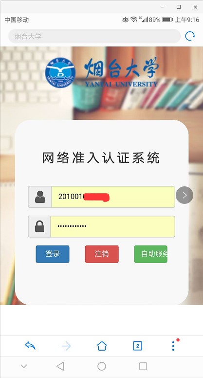 校園無線采用web認證,連接YTU后,打開瀏覽器會自動轉到下圖所示的認證頁面(有的瀏覽器不允許自動轉到認證頁面,這時需要手工在瀏覽器中打開煙臺大學官網http://www.9dwrui2.xyz,點擊右下角的“計費系統”);