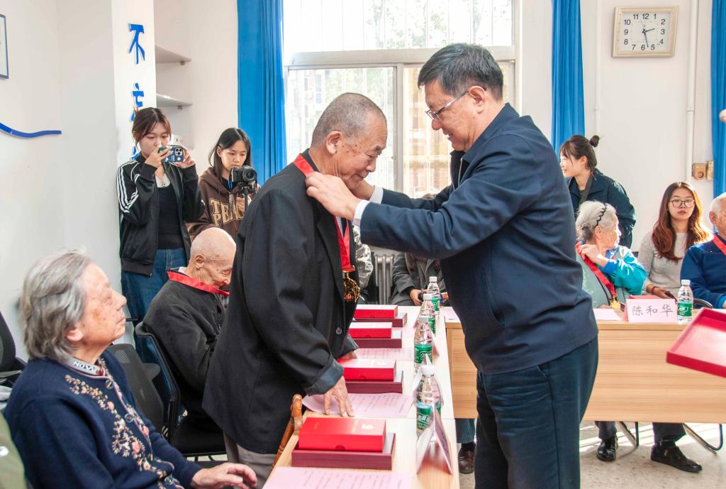 王強為老同志代表逐一佩戴“光榮在校40年”紀念章并頒發紀念品,代表學校黨委向55位自建校伊始,一直扎根煙臺大學從事教育管理服務工作的老一輩工作者表示崇高的敬意和衷心的感謝,并介紹學校近期工作開展情況。他表示,學校的發展成績離不開離退休老同志在職期間和退休后的付出和貢獻。希望大家在以建校40周年為新起點的新征程上,繼續發光發熱,老有所為,為加快建設高水平大學團結奮斗、奮楫篤行,為教育強國和中國式現代化建設貢獻“銀發力量”。學校將認真學習貫徹習近平總書記給“銀齡行動”老年志愿者代表回信的重要指示精神,聚焦老年人的急難愁盼問題,進一步完善舉措、精準服務,把老年人生活保障好、作用發揮好、權益維護好。