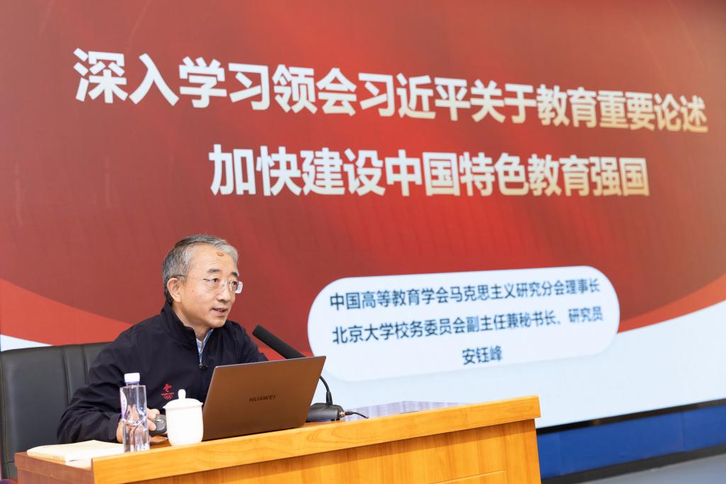 【本站訊】11月9日,中國高等教育學會馬克思主義研究分會理事長、北京大學校務委員會副主任兼秘書長、北京大學工會主席安鈺峰做客“北大、清華兩校名師講堂”,作題為“深入學習領會習近平總書記關于教育的重要論述 加快建設中國特色教育強國”的學術報告。報告由馬克思主義學院黨總支書記李祎主持。