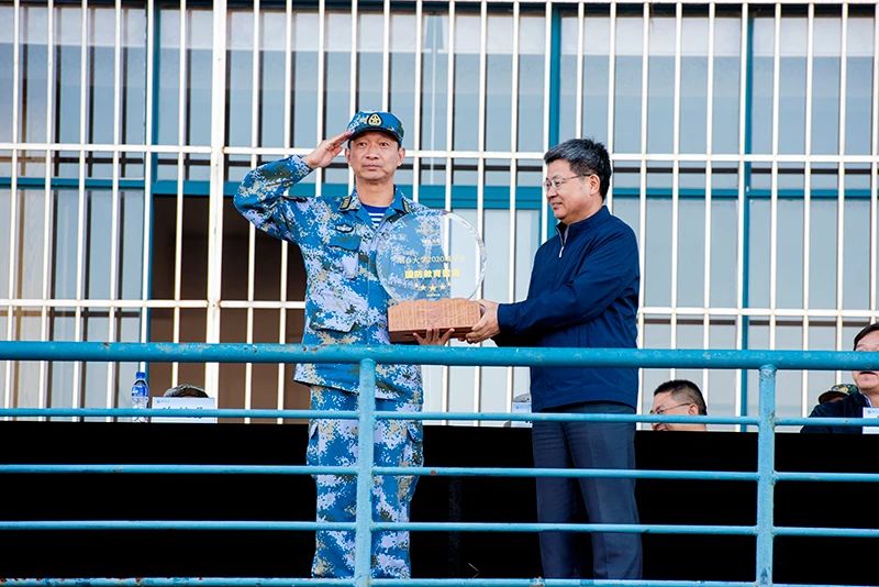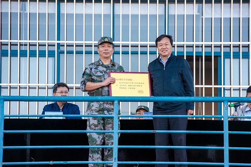 黨委書記張偉向中國人民解放軍海軍航空大學岸防兵學院贈送國防教育紀念牌,感謝對學校國防教育工作的指導。校長郭善利為2020級新生軍訓團頒獎,對今年軍訓工作取得的優異成績給予肯定。學校領導為在2020級學生軍訓工作中作出突出貢獻的保衛處、校醫院、社區服務中心等單位頒發特殊貢獻獎。紀委書記周勝良宣讀《煙臺大學關于表彰2020級學生軍訓先進集體及個人的決定》。學校對化學化工學院、藥學院、法學院、經濟管理學院、生命科學學院、光電信息科學技術學院、建筑學院、數學與信息科學學院等8個“軍訓先進學院”以及10個“分列式優勝方隊”、6個“歌詠比賽優勝隊”、19個“會操優勝排”、27個“內務優勝班”、177名“優秀學員”和37名“優秀教官”進行了表彰。優秀學員代表林玉青、優秀學生教官代表李貴偉、優秀輔導員教官孫世玉先后發言。