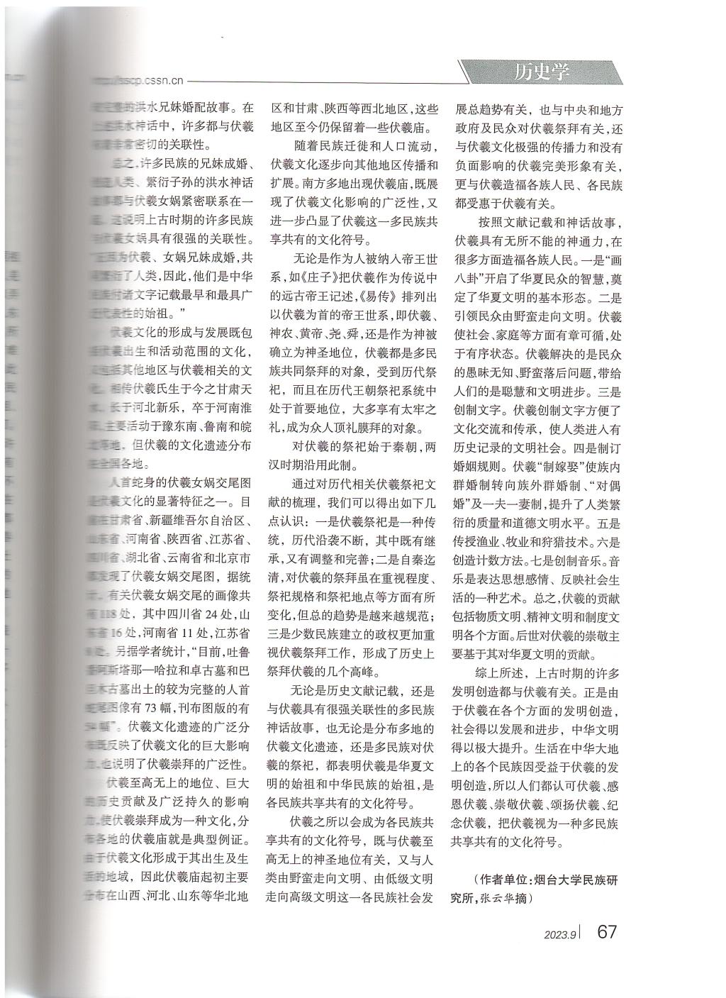 近日,《中國(guó)社會(huì)科學(xué)文摘》2023年第9期主體轉(zhuǎn)載了煙臺(tái)大學(xué)崔明德教授發(fā)表于《北方民族大學(xué)學(xué)報(bào)》2023年第3期的理論文章《伏羲:多民族共享共有的文化符號(hào)》。